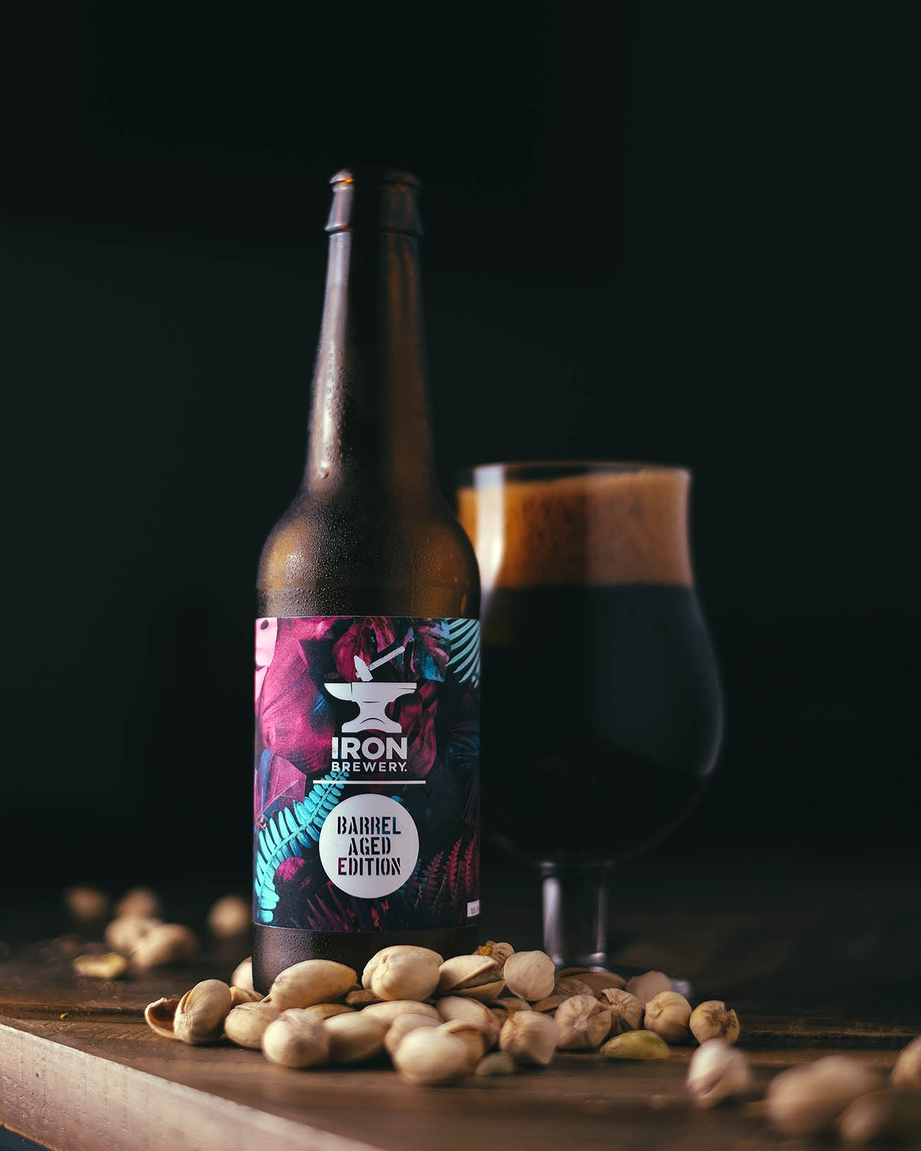 Imperial Stout vieilli en barriques de vin rouge avec ajout de fraise et de pistache.